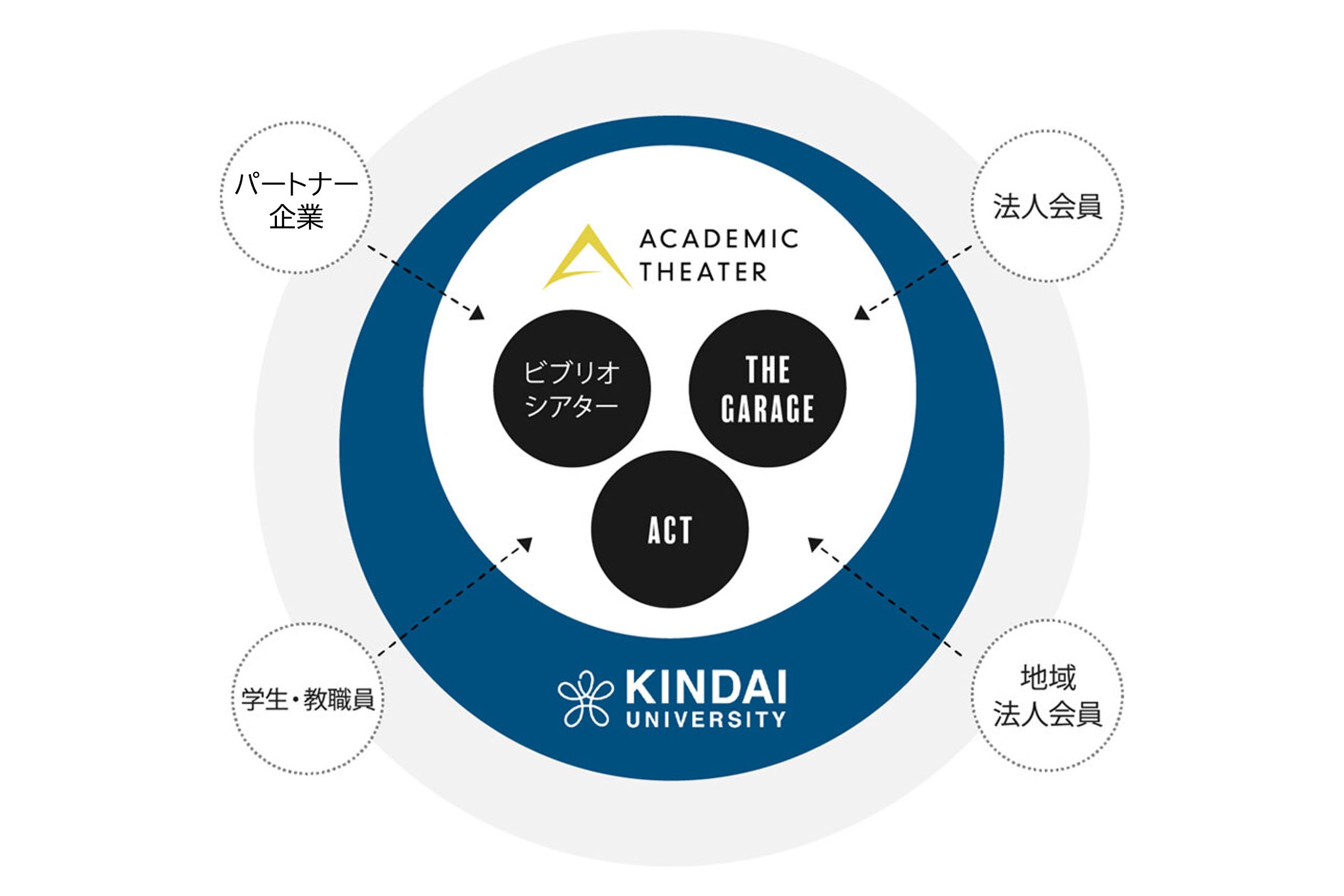 近畿大学アカデミックシアターは、建学の精神「実学教育」と「人格の陶冶」を礎に、学問的な知識や技能をアクティヴェイトする社会実践と、文理融合・領域横断的なリベラルアーツ教育を相補的に展開する”知の劇場”です。多様な学問分野を横断する独自の図書分類「近大INDEX」、新たな社会的価値を創造する実学プロジェクト「ACT EX(イーエックス)」、地元企業と協同したモノづくりの実験工房である「THE GARAGE」という三つの機能を通して、総合大学としての力を結集し、単一の専門分野では対応できない複合性、多面性をもった社会課題に向き合います。