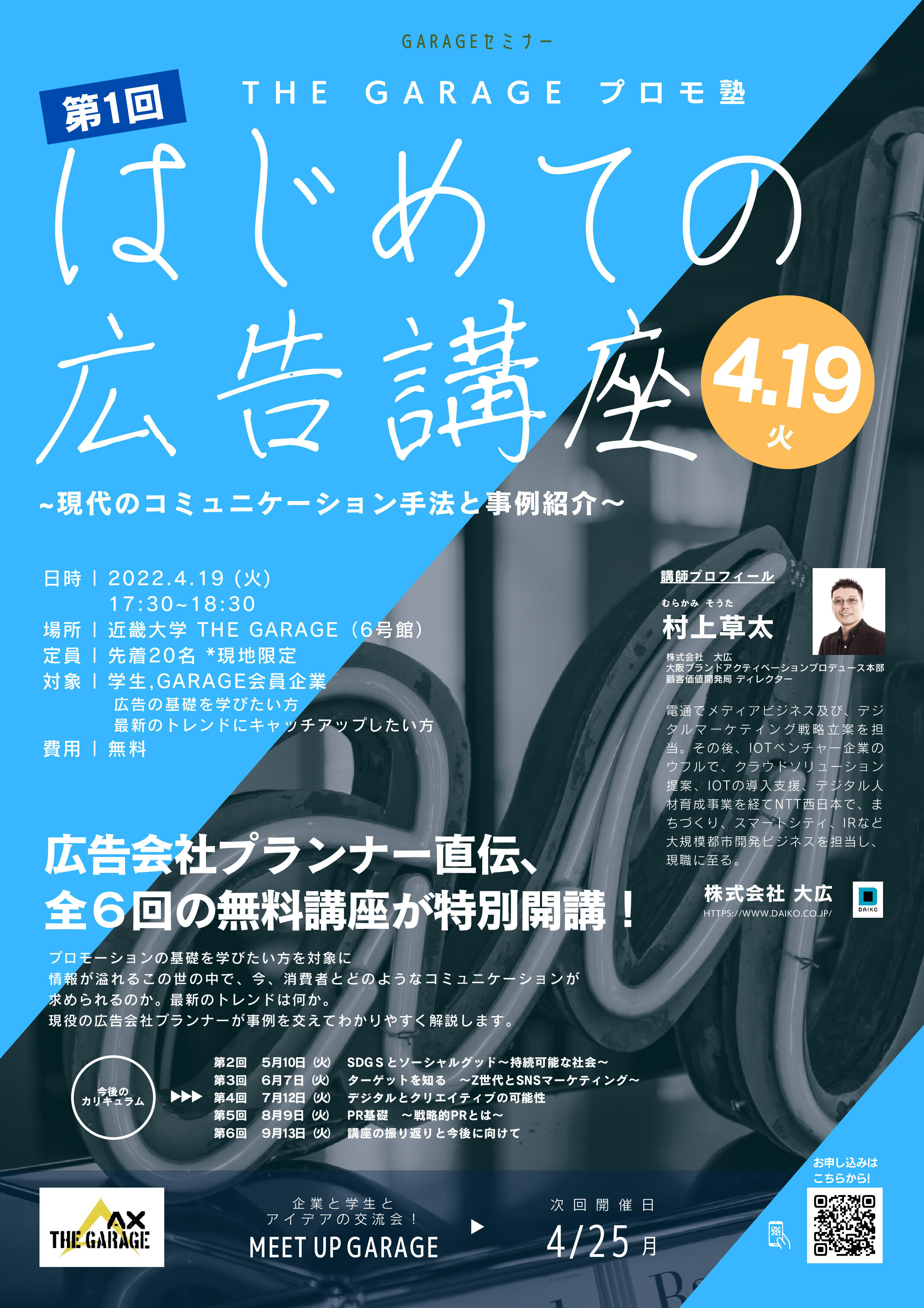 | 2022年04月19日 | 17:30~18:30 | 近畿大学 THEGARAGE(6号館) |
