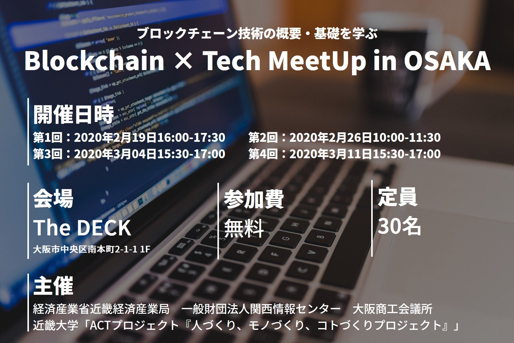 具体的にブロックチェーン技術への理解を深め、ブロックチェーンを活用したサービス開発を後押しするため、近畿経済産業局とも連携し、「近畿地域全体でプレーヤーとなる情報関連産業の強化」を図ることを目的に、ブロックチェーンを実際に利用して概要を学びつつ、その技術的な仕組みを理解する全4回の講義を開催します。