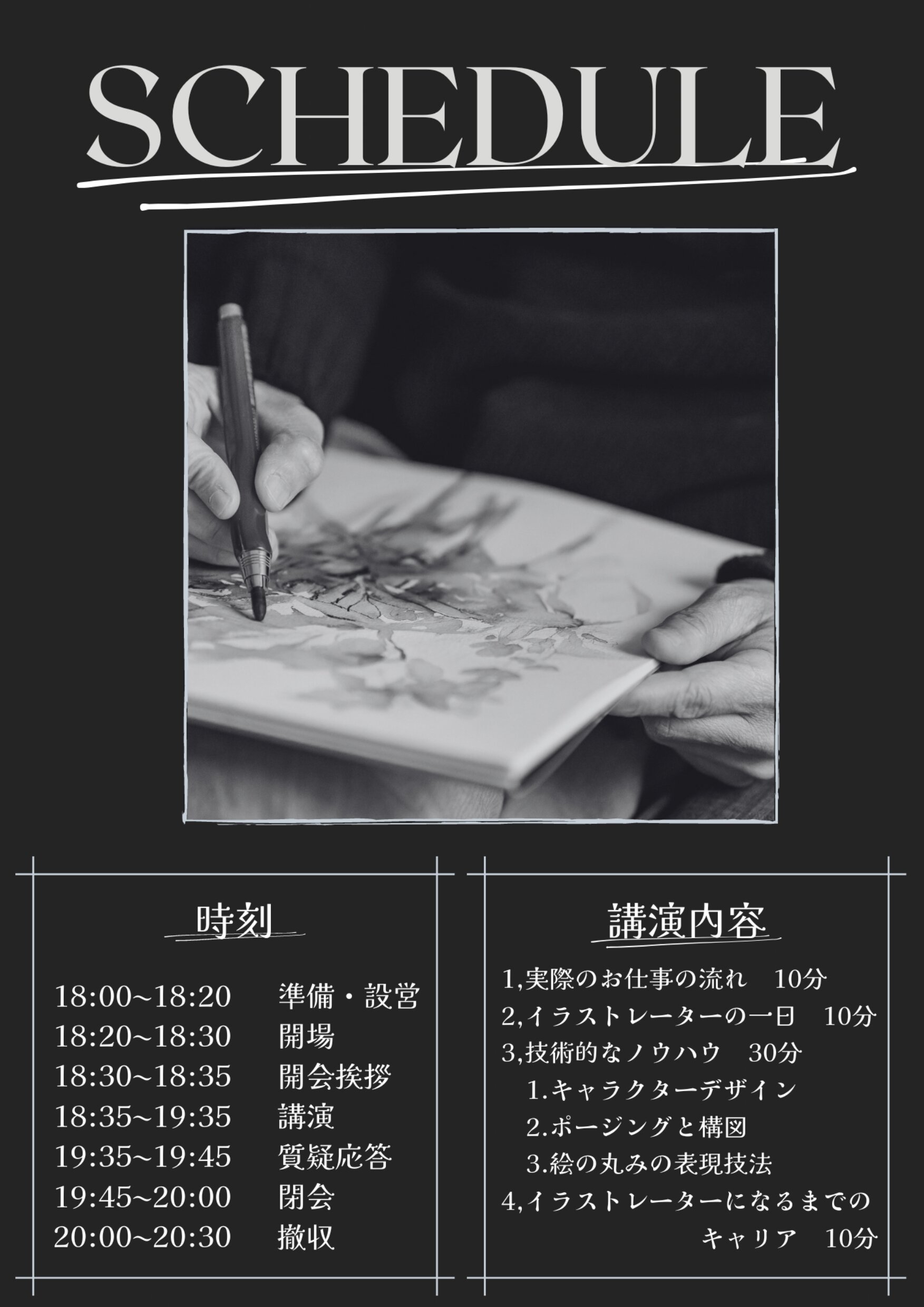 お仕事の流れなどもお話ししていただけるので、イラストレーター以外の職種でも為になるお話と思われます!