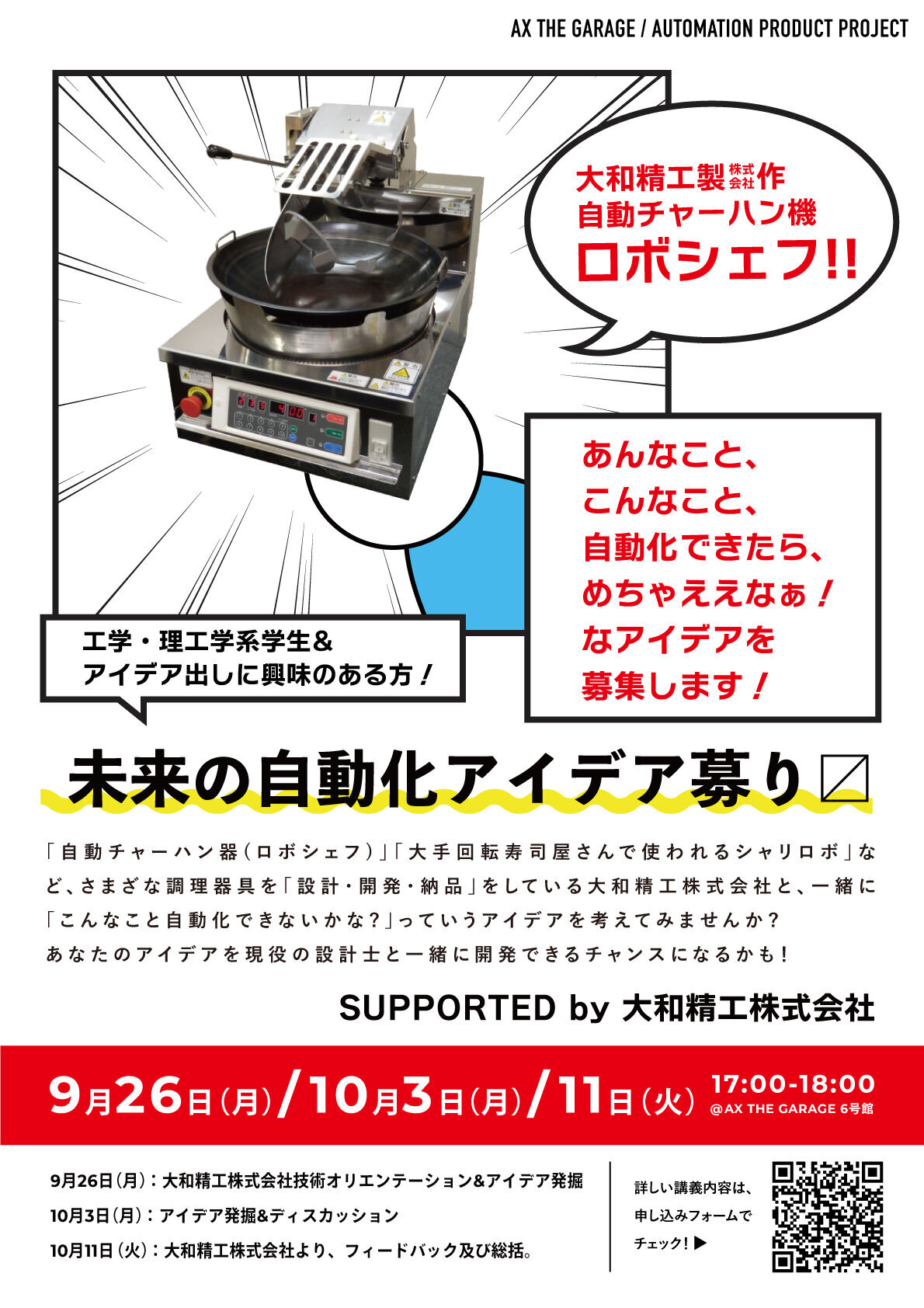「自動チャーハン器(ロボシェフ)」「大手回転寿司屋さんで使われるシャリロボ」など、さまざな調理器具を「設計・開発・納品」をしている大和精工株式会社と、一緒に「こんなこと自動化できないかな?」っていうアイデアを考えてみませんか?