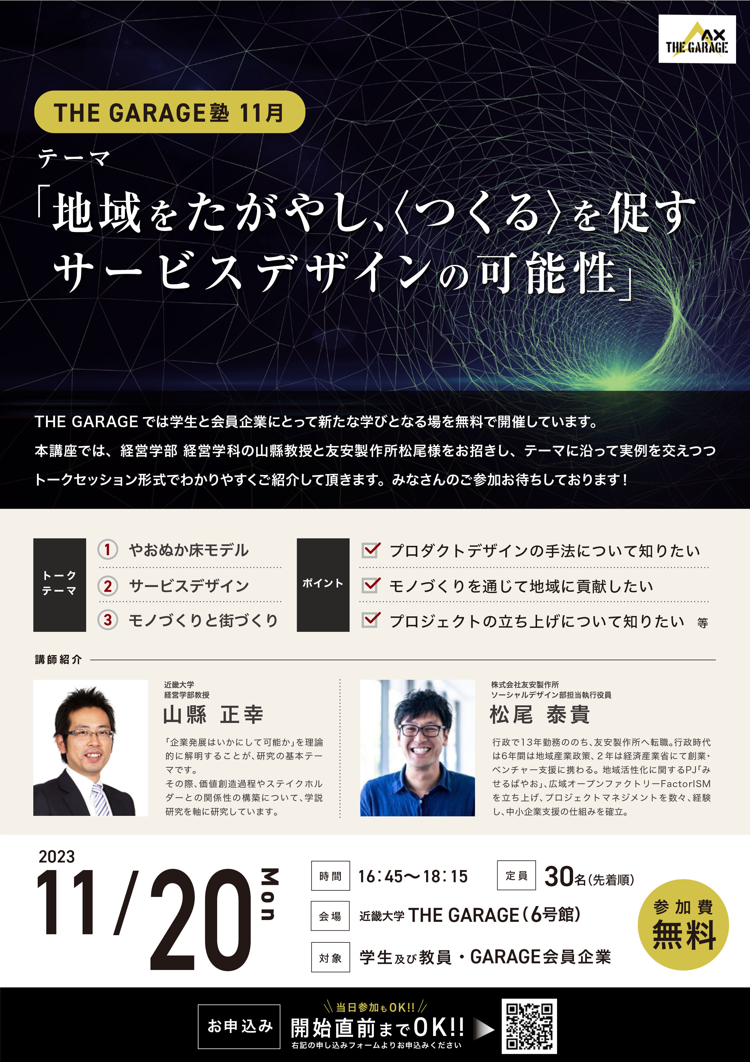 | 2023年11月20日 | 16:45~18:15 | THE GARAGE(6号館1階) |