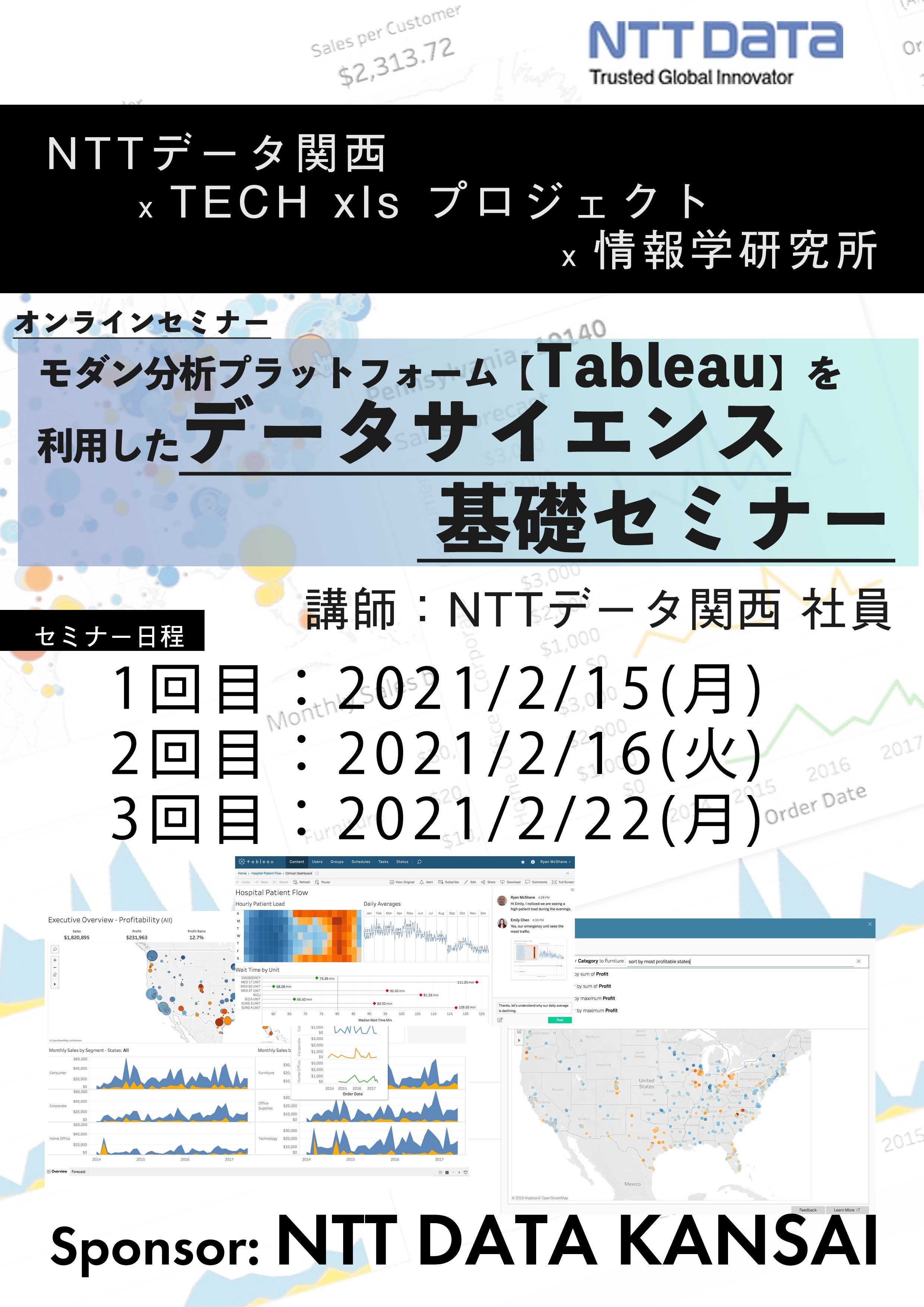 世界でも人気の高いモダン分析プラットフォーム Tableauを利用し、あらゆるデータを迅速かつ容易に実用的なインサイトを引き出すデータサイエンティストとしての基礎を学ぶセミナーです。