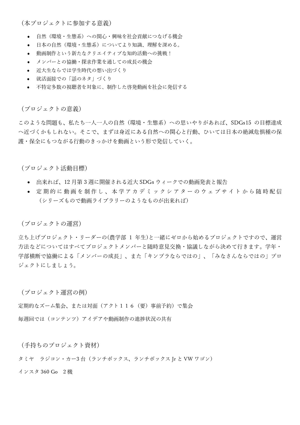 「タミヤRCカーを活用した絆・学習イベント、またはRCカーから撮る写真・動画の制作・配信」によって「学生と社会、学生とモノ、学生とコトを結び、日本を元気にする近大ならではの楽しく、遊び心満載の学生の成長・進化、地域・社会貢献」を目指すプロジェクト。マグロ大学ではなく、近畿大学生のならではの社会への情報発信と問題提示。