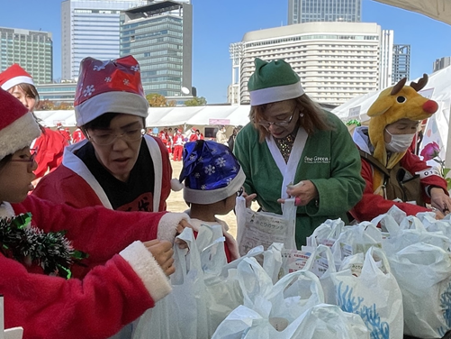 大阪城公園「太陽の広場」みどりのサンタブースで受付し、みどりのサンタの衣装に着替え、出発に備えて準備しました。出発前にテラプロジェクト理事長の小林昭雄先生(大阪大学名誉教授)からイベントの趣旨説明と当日の流れや注意事項等についてテラプロジェクト峯平さんから説明がありました。