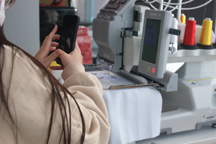 どんどん出来上がっていく刺繍を不思議そうに見つめるお二人。その間にも刺繍は出来上がっていきます。記念にパシャパシャと撮影会。
