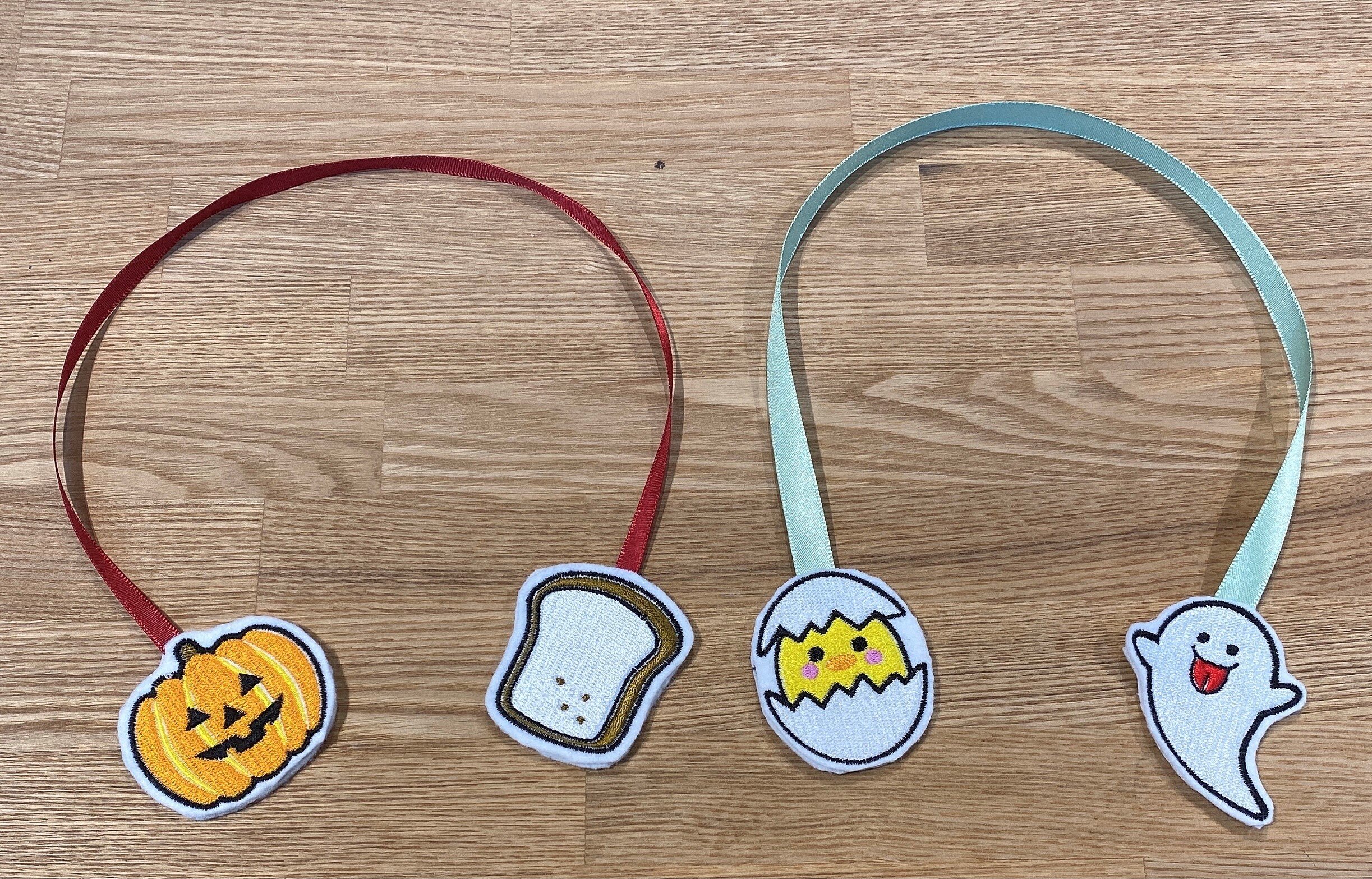 切った刺繡たちにリボンを挟んで手芸用ボンドで貼り合わせたら・・・